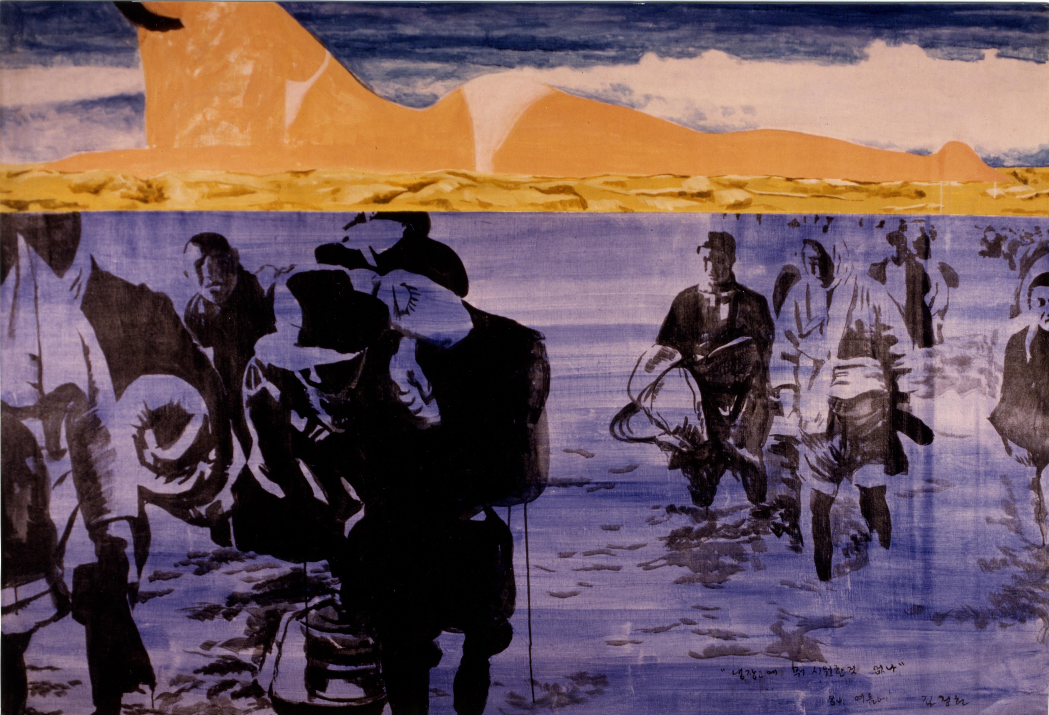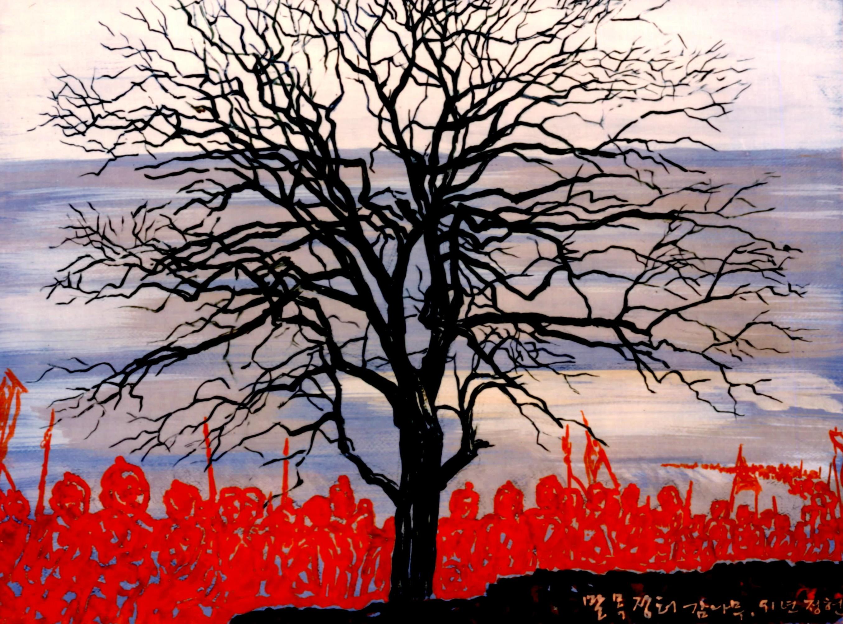 부동산 자본으로서의 토지가 아닌, 생명을 일궈내는 농촌의 땅 위에서 소박한 삶을 이어가는 민중에 대한 김정헌의 관심은 동학농민운동으로도 이어져 다수의 작품에서 관련한 요소들을 자주 등장시켰음을 발견할 수 있다. 봉기의 시작점이었던 정읍 말목장터의 나무, 전봉준과 농민들의 형상, 특히 최대 격전지였던 공주 우금치에 위치한 기념비는 직접 여러 번 현장을 답사하며 남긴 사진과 드로잉 자료가 확인되어 동학농민운동을 깊이 탐구하며 당시의 시대상을 현재의 세태와 겹쳐 투과하듯 바라보고 있었음을 짐작할 수 있다.