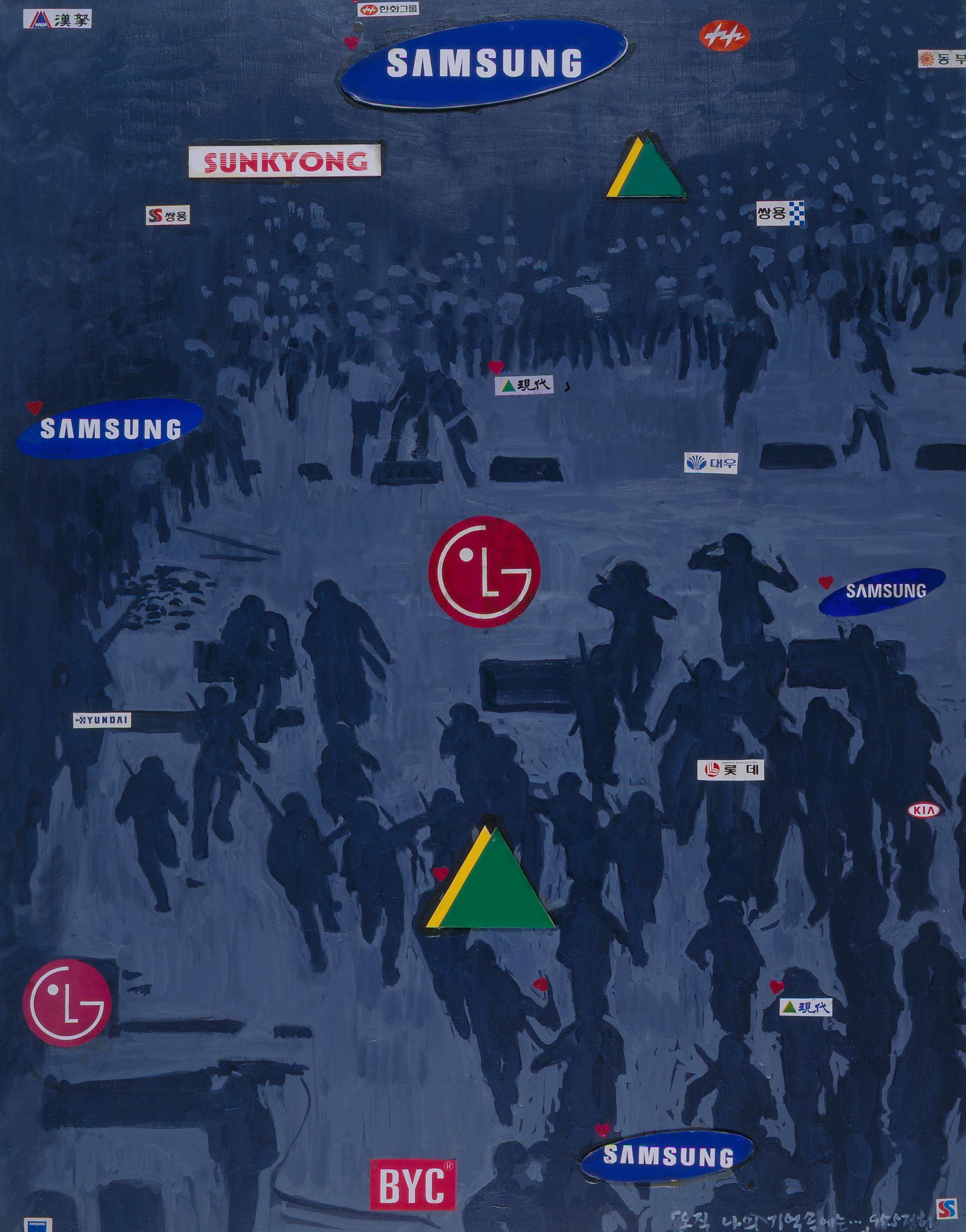 나아가 작품을 통해 실제 군부로 대표되는 지배 권력이 민중에 자행한 폭력에 대한 직접적인 발언을 하는 것도 개의치 않았는데, 1995년 개최된 《제1회 광주비엔날레》에 출품한 <오직 나의 기억 속에는…>(1995)에는 5.18 광주민주화운동 당시의 이미지와 기업 로고의 레이어를 겹쳐 표현했다. 한 화면 속에 공존하면서도 서늘한 대비를 이루는 김정헌 고유의 스타일을 확인 할 수 있는 한편, 작품을 위한 습작에 남긴 메모에서는 민주화 항쟁 이후에도 지속되어야 할 저항에 대한 의지를 다지는 모습도 엿보인다. 실로 김정헌에게는 작품 활동과 사회에 대한 발언이 분리된 것이 아닌 통합이자 연장선상에 있었음을 보여준다.